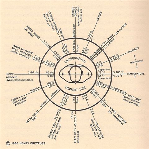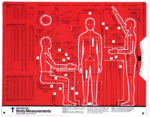 Henry Dreyfuss (1904 – 1972) fue un destacado diseñador industrial estadounidense. Su mayor legado al diseño y la ergonomía fue la profunda investigación acerca de la antropometría, y sus descubrimientos, publicados en sus libros Designing for people(1955) y The measure of man (1960). De este último sacamos las siguientes ilustraciones de las medidas del ser humano en relación al espacio que ocupa.