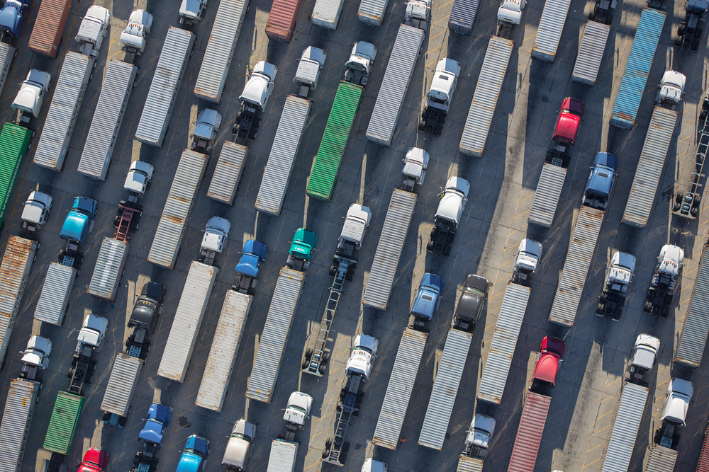 Cientos de camiones en fila para entregar sus containers y las enormes naves que transportan éstos componen este cautivante trabajo de Kelley.