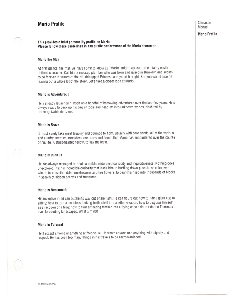 Ahora el sitio Press the Buttons publicó mayores detalles de este manual, en donde se especifican algunos curiosos detalles sobre los personajes, tales como la explicación de por qué cada personaje se caracteriza por un color o por una forma determinada. Y ahora no solo se limitan a Super Mario Bros, también aparece detalles de Kirby, Samus Aran de Super Metroid y Pauline de Donkey Kong.