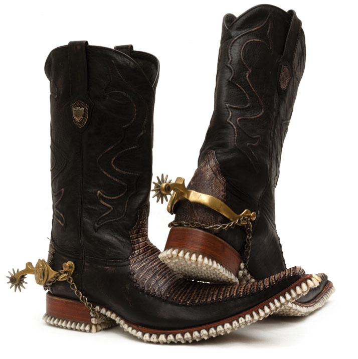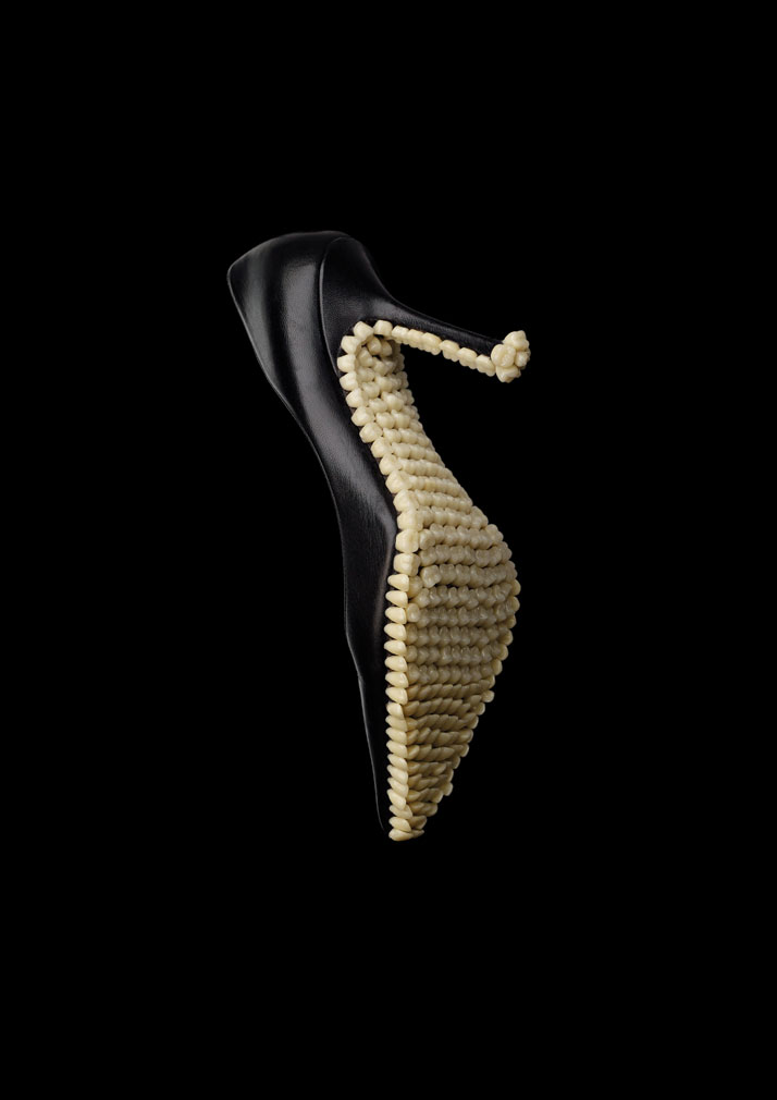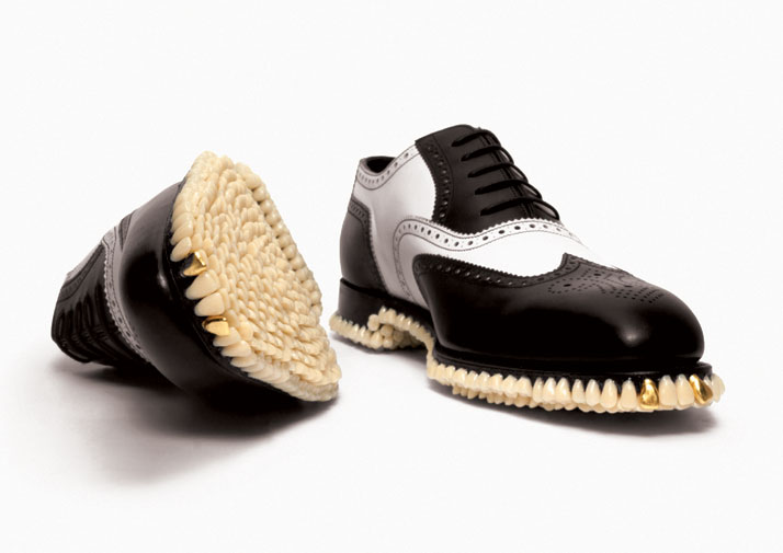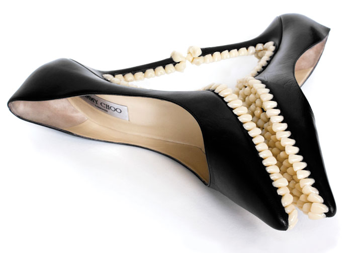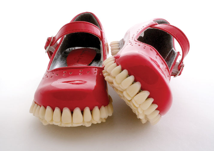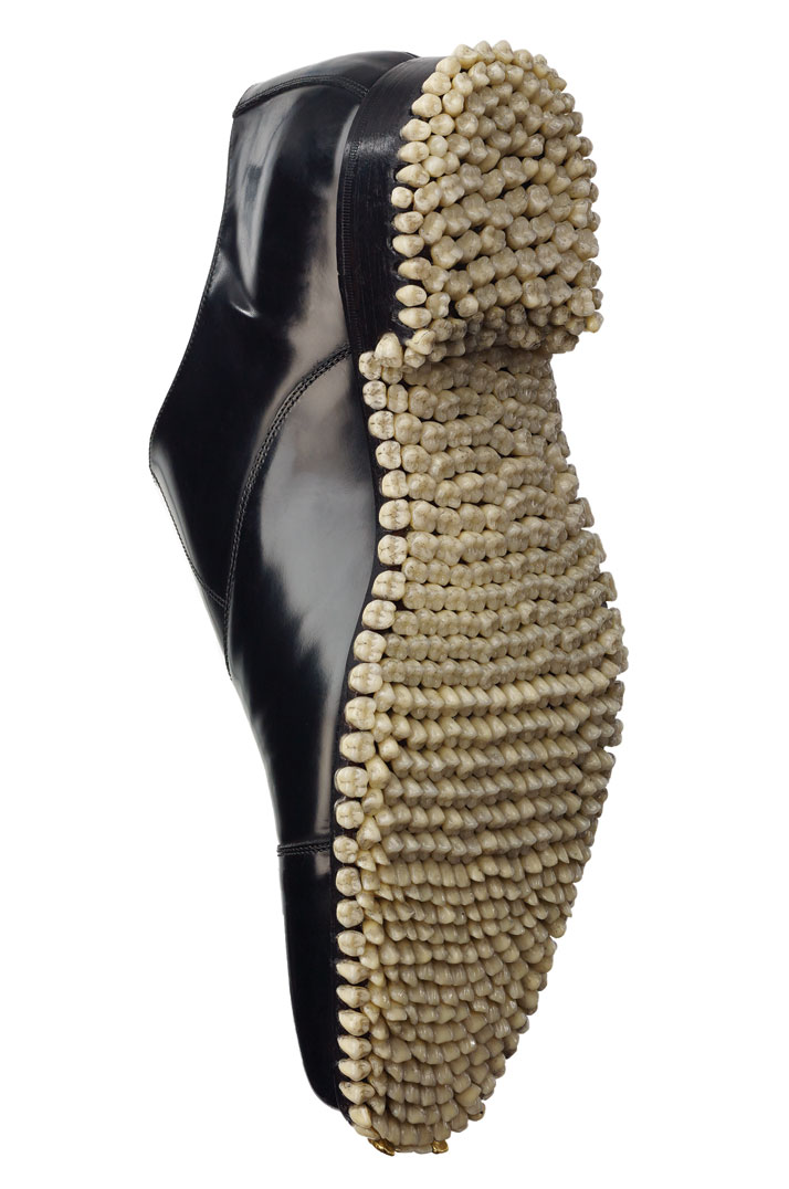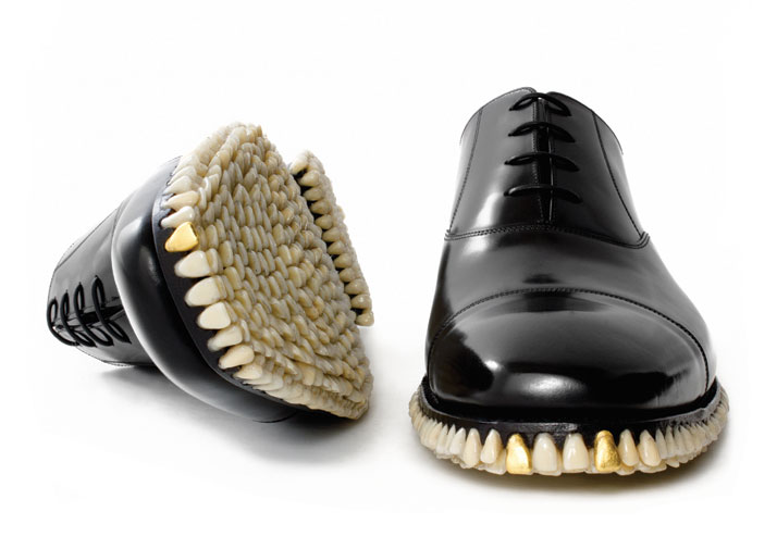 El dúo de artistas londinenses Mariana Fantich y Dominic Young, conocidos colectivamente como Fantich & Young, crean esculturas innovadoras utilizando objetos encontrados. Su serie «Apex Predator» imagina con un toque fantástico la historia de la evolución y la moda. Los artistas han pegado dientes y muelas de prótesis dentales a diversos tipos de calzado para crear zapatos con el aspecto de amenazantes mordidas.