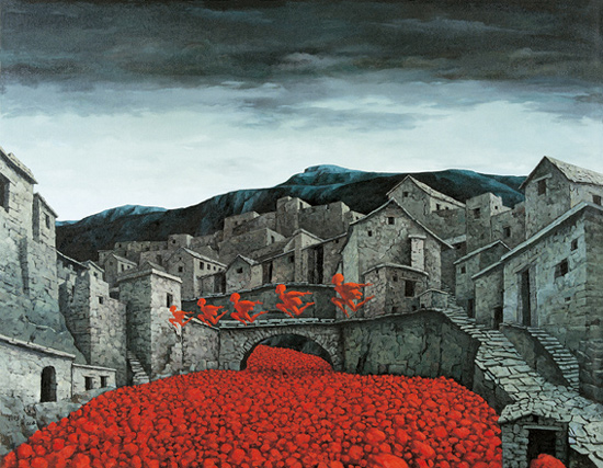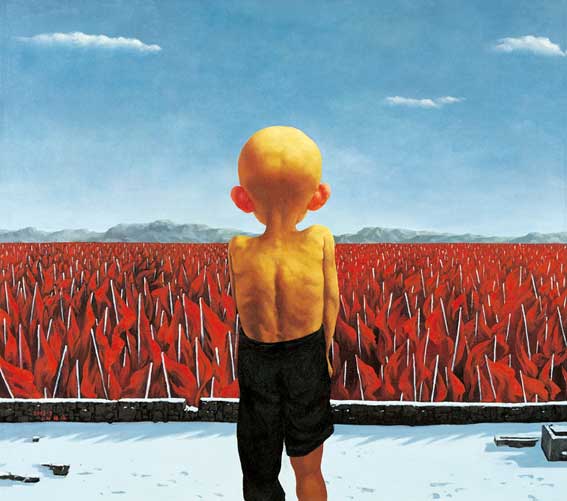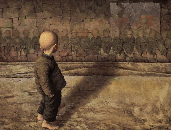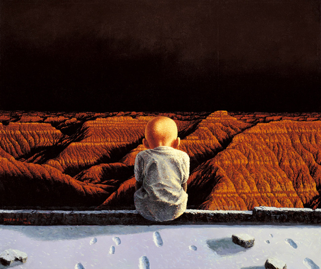 Las pinturas de los niños calvos vagando, o que sobrevuelan, desérticos paisajes o aldeas rurales, son características de sus obras. Este tema fue elegido en la universidad, derivado de su dolor personal y tristeza que sufrió desde niño, donde refleja sus luchas y sueños de infancia de liberación y escape.